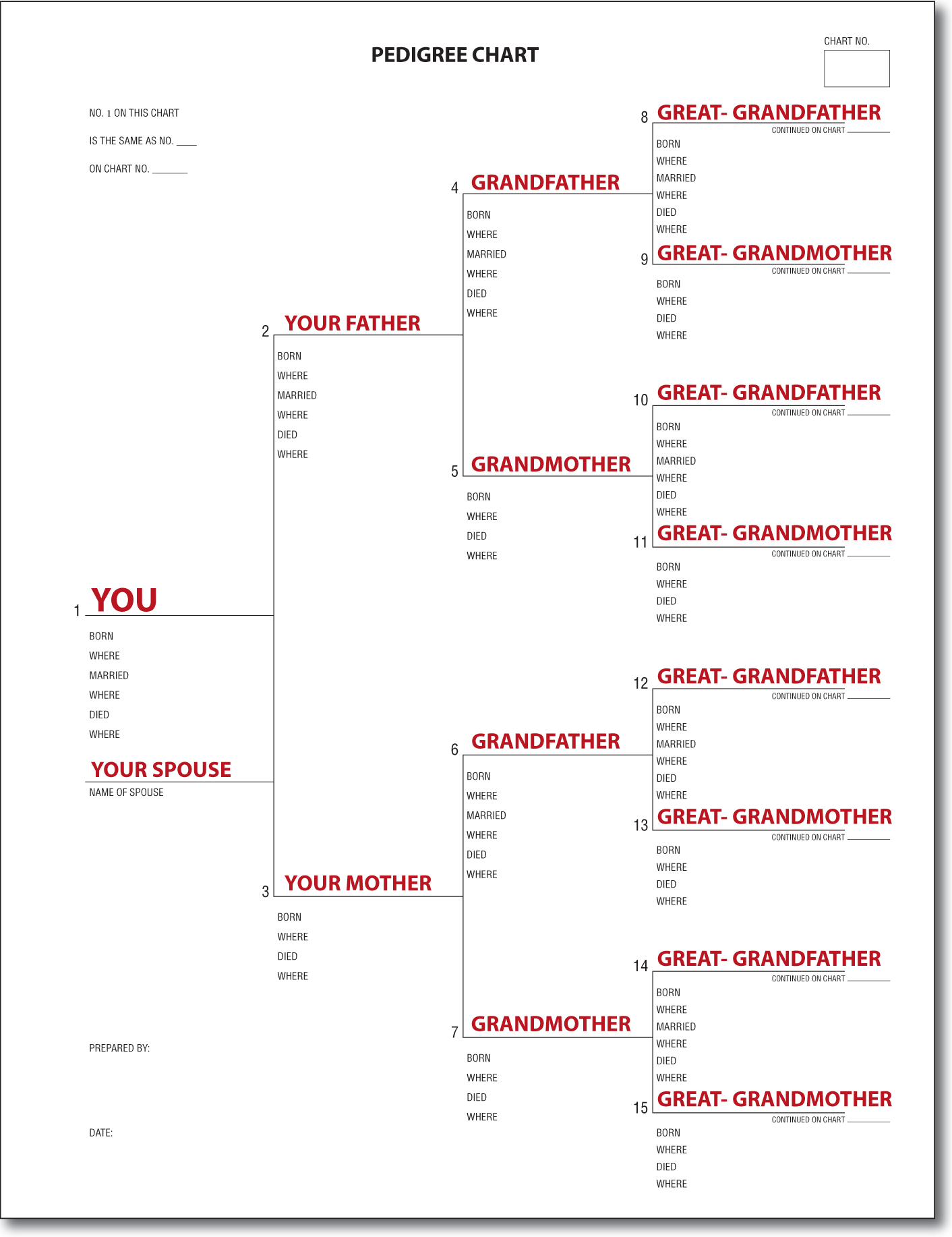 You fill in the chart starting with yourself as Number 1 — your father is Number 2, your mother Number 3. Your father’s side of the family will be on the top half of the chart and your mother’s side will be on the bottom half of the chart.