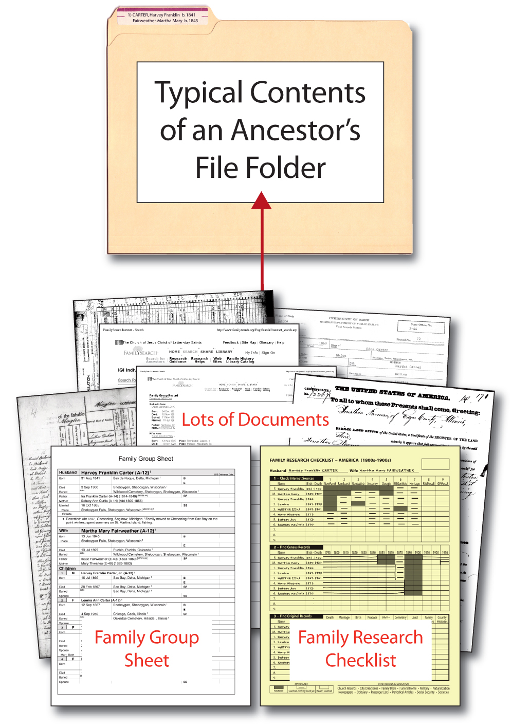 Once you’ve finished this, then everything you know about each of your ancestors will all be collected in a single file folder. Then you’ll be able to easily evaluate the information you have, and know what information you still might need. And it will make entering the family information into the computer extremely easy.