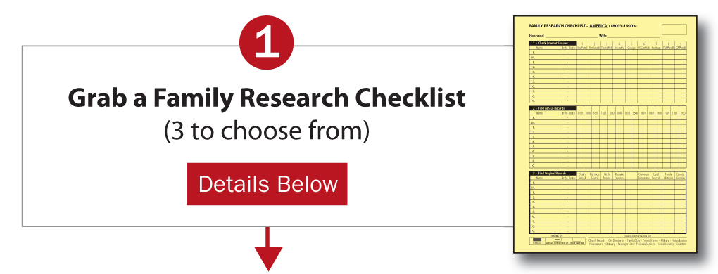 When you start researching a family, grab a Family Research Checklist to easily keep track of where you’ve looked and what you’ve found. There are 3 versions of the Checklist to choose from — depending on when your ancestors lived, and whether they lived in America or in a Foreign Country.