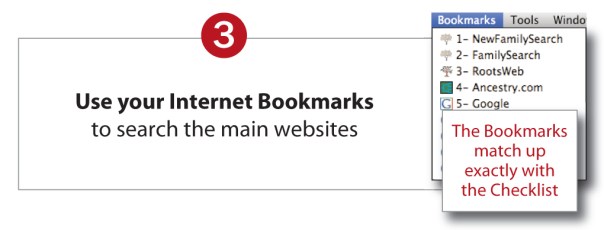 With your Checklist in hand, you’re ready to get on the Internet and start researching your family. We designed the Checklist to match up with your Internet Bookmarks to make it easy to track the main Internet sites you’ll be visiting.