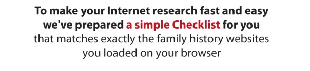 Mark off your Checklist as you research your family. This lets you see at-a-glance which of the main websites you’ve visited, and whether or not you’ve found anything.