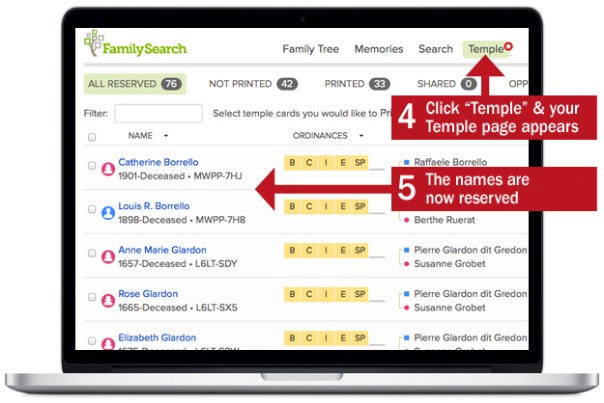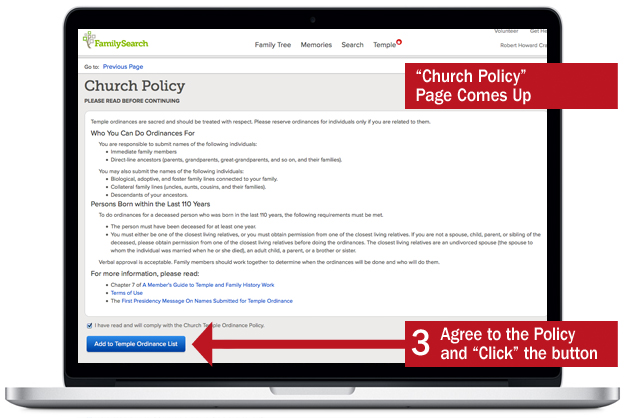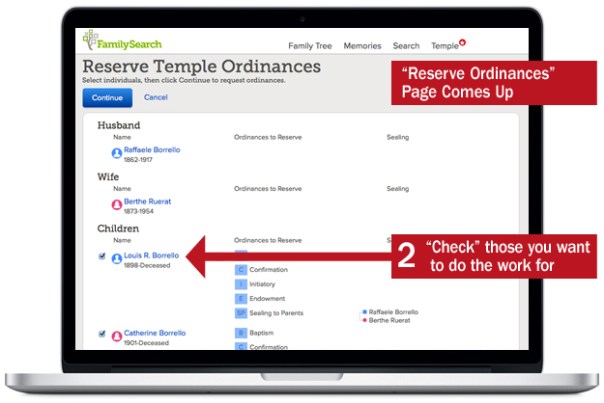 When you find this green arrow above any of your ancestors, that means they’re ready to have their temple work done. Just click on the “Temple Work Ready” green arrow, and then you’re prompted the rest of the way what to do. The screen shots below show you exactly what’s involved.
