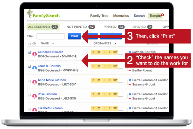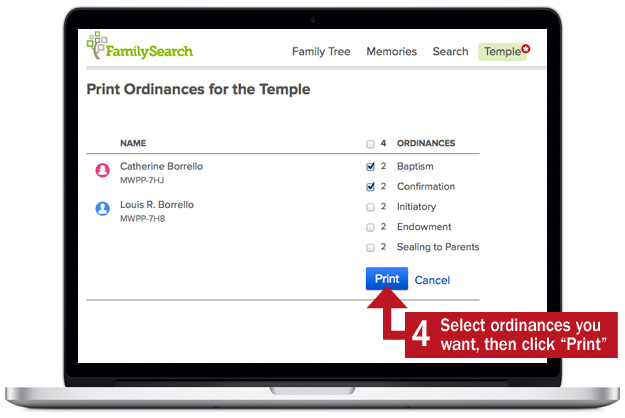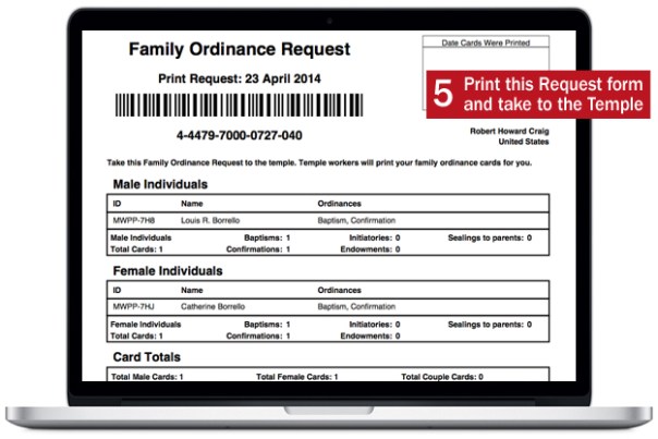 To perform the temple ordinances for you family, you need to print a Family Ordinance Request form (listing the names and ordinances you want to perform) and take it to the temple with you. It looks like a lot of steps here, but it’s not. You’ll click through these windows pretty quickly.